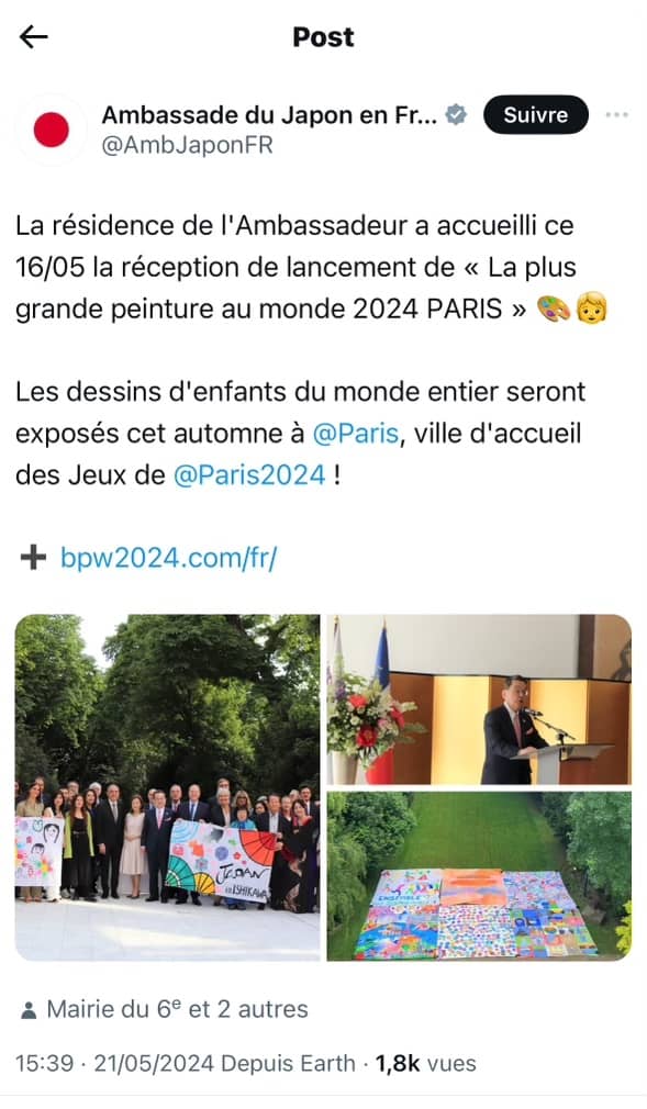 Chères amies et Chers amis de la Plus Grande Peinture au Monde, La première exposition dans le jardin à la résidence de l'ambassadeur du Japon en France en mai 2024 Erratum :Dans notre précédente newsletter, il y a eu une erreur concernant le nom d'écoles du 6e arrondissement de Paris. Nous nous excusons pour cette erreur et tenons à préciser les informations correctes sur les écoles participantes et leurs contributions exceptionnelles à notre projet.Les écoles participantes: en haut, de...