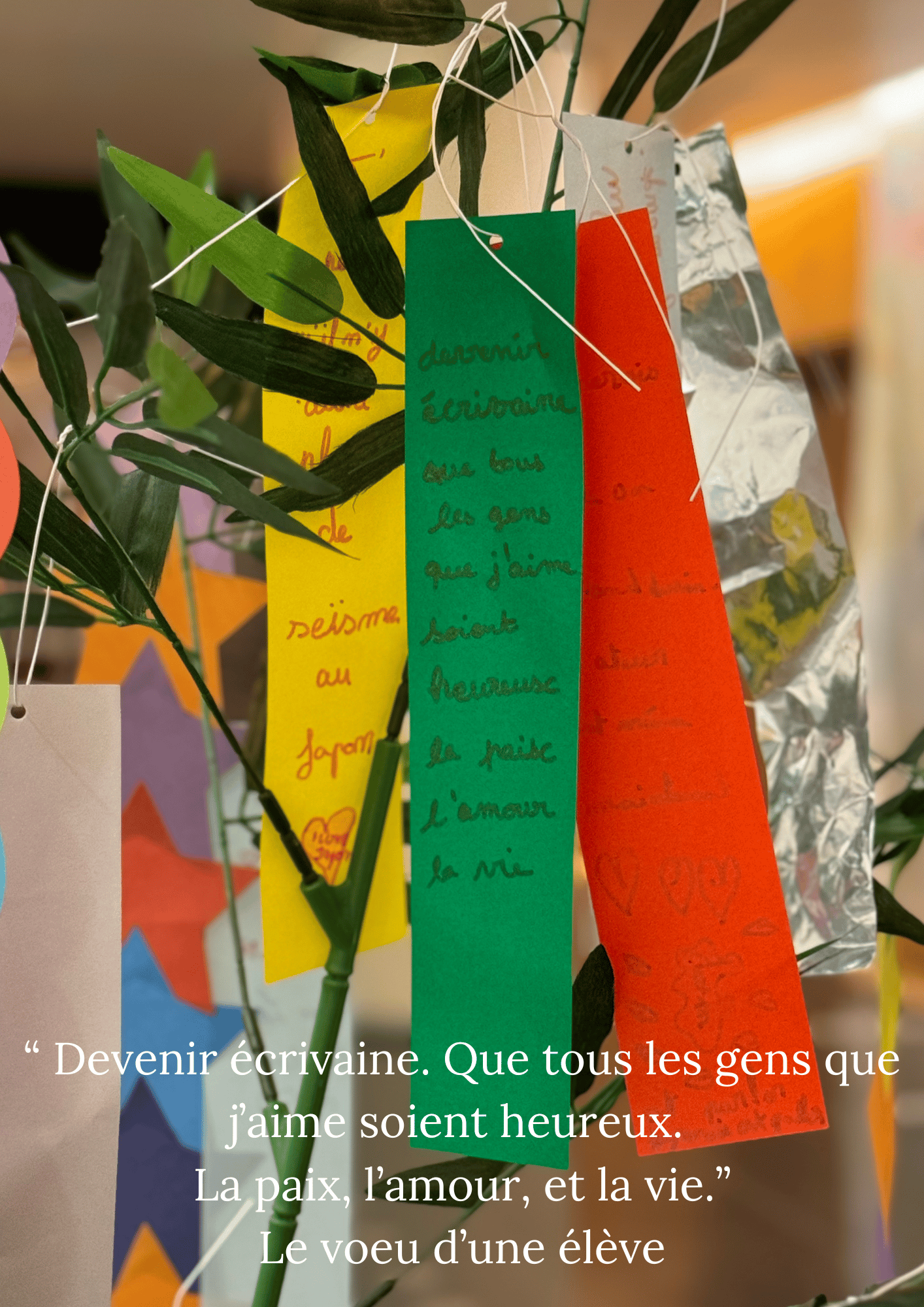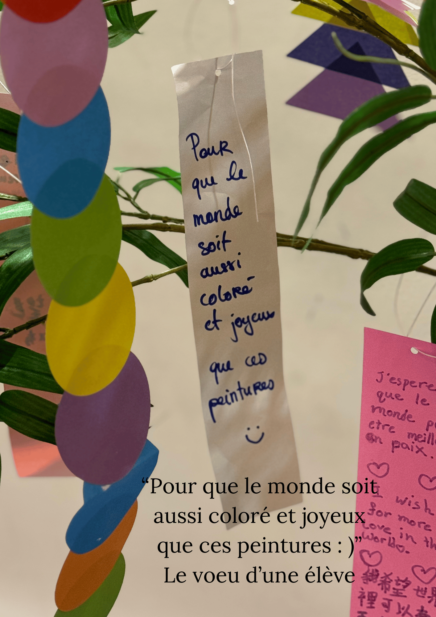 Lors de cette visite, les enfants ont également participé à un atelier de Tanabata, une tradition japonaise où chacun écrit un souhait sur un morceau de papier et l'attache à une branche de bambou. "Je voudrais être écrivain pour que les gens que j'aime vivent en paix et en amour". Ce témoignage nous a émus par sa profondeur. Les Événements à ne pas manquer L'exposition à la Maison de la Culture du Japon à Paris se poursuivra jusqu'au 13 juillet. Entre le 8 et le 12 juillet, nous serons en mesure d'accueillir des groupes de 25 élèves pour des visites guidées et des ateliers de Tanabata. Si vous souhaitez participer, veuillez faire votre demande via email à l'adresse suivante: yuki@workingprincess.co Comme le mentionne le voeu de cette élève sur la photo, nous espérons que le monde sera coloré comme les peintures réalisées par les enfants grâce à ce projet merveilleux.